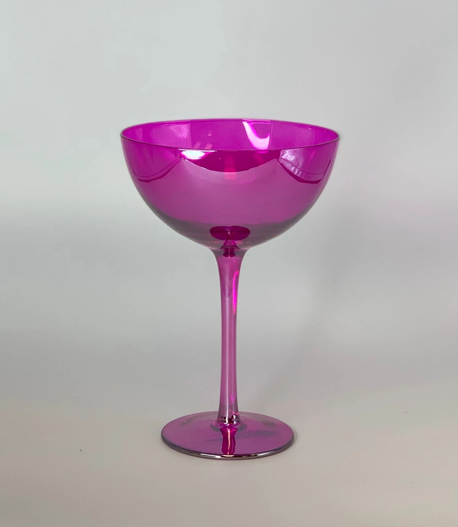 These colorful candy coupes are perfect for sipping your favorite cocktail or holding sweet sorbets and desserts! Glimmering glass is coated in shades of purple, pink, green and gold, then covered in an irresistible iridescent finish that will make all of your sweets and sips sparkle and shine.Â