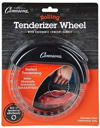 Nifty little tool for tenderizing steak, chicken and lamb. Easy use – just roll across the surface of the meat to perfectly tenderize and increase marinade absorption.