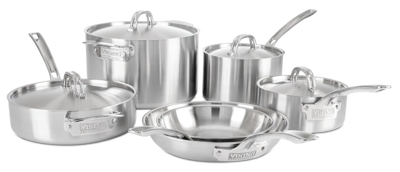 Viking 5-Ply Professional Cookware provides commercial grade quality for in-home use. With an elegant satin finish and five layers of metal, this premium line of cookware is specially handcrafted in the USA. 5-ply construction maximizes heat transfer and reduces energy usage, features that enable Viking cookware to deliver superior cooking performance. Each layer of metal is created to provide durability and efficiency. The exterior layer is a magnetic stainless steel that makes the cookware suitable for induction stovetops. The next layer of aluminum alloy bonds to the middle layer, which is pure 3004 aluminum. The fourth layer is an aluminum alloy bonded to the interior 18/10 high-grade stainless steel. Together, these five layers work in unison to transfer heat quickly and evenly while using less energy to achieve desired cooking temperatures