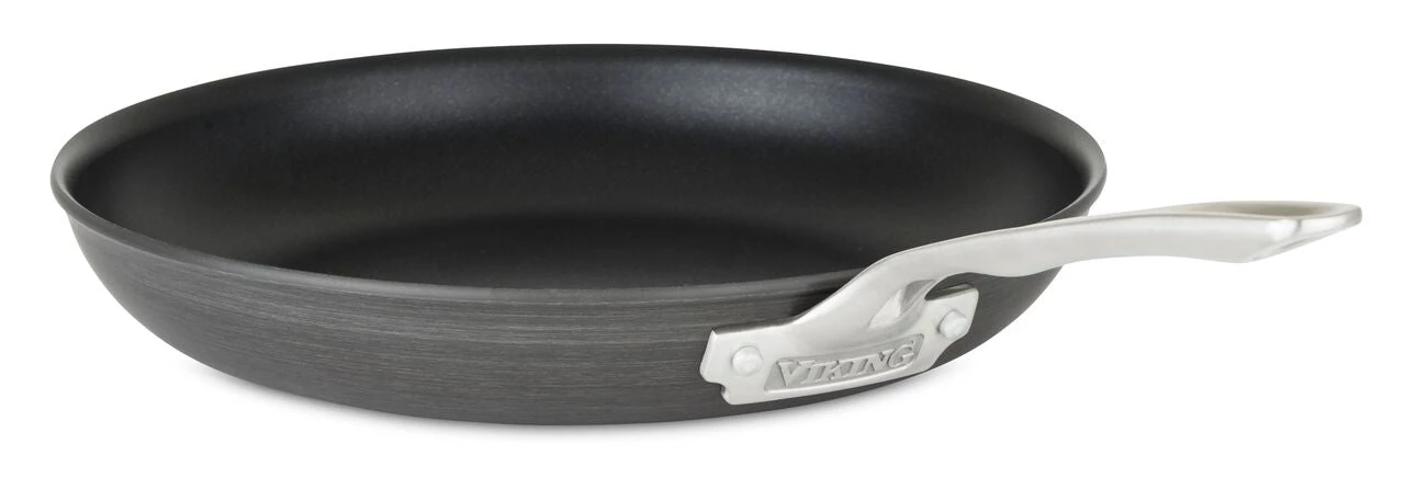 Experience even heat and exceptional release with Viking Hard Anodized Nonstick Cookware. Constructed with heavy gauge anodized aluminum for durability and even heat distribution throughout the sides and bottom of the pan, Viking Hard Anodized Cookware features a stainless steel base making it exceptionally stable and compatible with all cooktops including induction. Accepted worldwide as one of the most conductive metals for cooking, the aluminum is strengthened through the anodizing process until it is twice as hard as stainless steel. Featuring PFOA free nonstick, each piece is coated with three layers of durable nonstick coating to ensure maximum release and longevity, even when using metal utensils. The multi-layer coating improves release and protection even if the top layer is scratched over time. The fry pans feature flared rims for easy tossing and drip-free pouring, while the sauce pans, saute and Dutch oven feature cut rims to enhance the lid fit, helping keep moisture and nutrients inside the pan during cooking. The saucepans and larger vessels feature interior measurement markings for accurate addition and reduction of ingredients. Tempered glass lids allow you to “look and cook” as you watch the progress of your meal. Designed with ergonomics in mind, Viking signature handles are hand crafted from cast stainless steel and riveted to the pan for a lifetime of durability. Lid handles and long handles feature heat breaks to help them stay cool on the cooktop during use. Long handles feature a finger stop that guides your hand to the perfect grip for comfort, balance and control. Viking Hard Anodized cookware can be used on all cooktops, including induction, in the oven, or on the grill up to 500F, making it perfect for finishing dishes the same way a professional chef does. The glass lids are oven safe to 350F. Viking Hard Anodized Nonstick cookware is dishwasher safe and backed by a limited lifetime warranty.