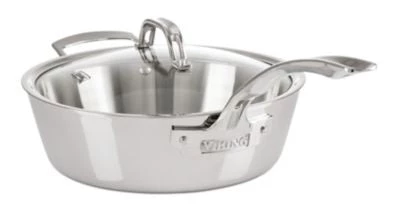 The Viking Contemporary 3-Ply Stainless Steel 3.6 Quart Saute Pan uses a modern, Windsor pan design. Its conical sides are angled out to ensure more room for evaporation while more heat is retained by the walls – resulting in faster cook times. Internal markings in both US and metric units make measuring much easier. And the vented glass allows you to monitor your cooking progress while preventing boil overs. Like all Viking Contemporary cookware, this pan is constructed with an aluminum layer sandwiched between two layers of 18/10 stainless steel – providing exceptional heat transfer while making the pan durable and usable on all cook tops including induction. Along with the ergonomic grip that stays cool, this cookware product heats up to 600/315 degrees (F/C) (450/232 degrees with lid). Dishwasher safe and comes with a limited lifetime warranty.