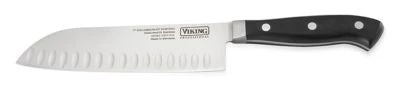 This Professional Series 7″ Santoku Knife with Hollow Ground from Viking is a superior tool. Viking specialty knives are designed for a specific task and this Santoku knife is certainly no exception. This knife is made to the same standards as other Viking cutlery but with a design made specially to chop, dice and mince with ease, as it is known for it’s sharp edges that enhance its cutting performance. The hollow ground design not only adds style, but helps to release thin slices and sticky food after slicing. If you have small hands, or find a cleaver a little overwhelming, a Santoku knife is a good alternative, providing comfortable control and excellent cutting performance. Handcrafted in Solingen, Germany, every Viking Professional knife is forged and ground from a single piece of high-carbon, stainless steel alloy. The results: the finest cutting edge perfectly balanced and easily sharpened with a triple-riveted, long-lasting handle. Lifetime manufacturer’s warranty. Product Features Viking 7″ hollow ground blade Hollow-ground dimples create air pockets and reduce drag when cutting delicate fish/meat Handcrafted in Germany of high-carbon stainless steel Ice-hardened stainless steel to increase durability and retain sharpness Full length tang for balance and durability Manufacturer’s Limited Lifetime Warranty against manufacturing defects Hand wash recommended
