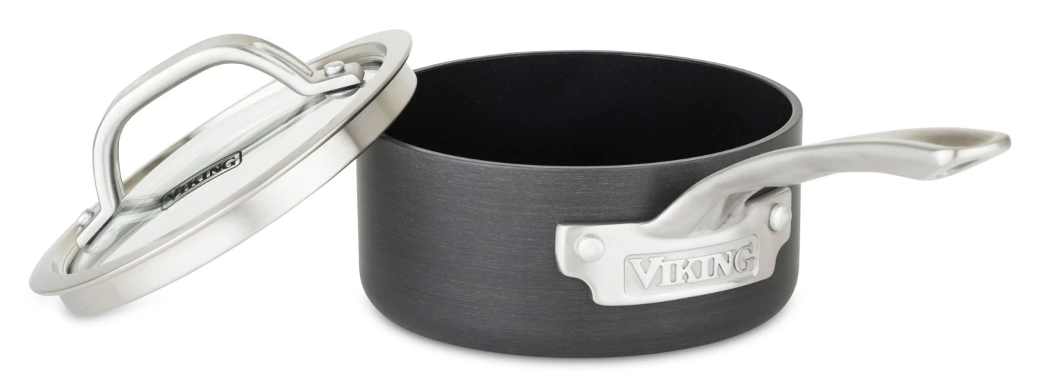 Experience even heat and exceptional release with Viking Hard Anodized Nonstick Cookware. Constructed with heavy gauge anodized aluminum for durability and even heat distribution throughout the sides and bottom of the pan, Viking Hard Anodized Cookware features a stainless steel base making it exceptionally stable and compatible with all cooktops including induction. Accepted worldwide as one of the most conductive metals for cooking, the aluminum is strengthened through the anodizing process until it is twice as hard as stainless steel. Featuring PFOA free nonstick, each piece is coated with three layers of durable nonstick coating to ensure maximum release and longevity, even when using metal utensils. The multi-layer coating improves release and protection even if the top layer is scratched over time. The fry pans feature flared rims for easy tossing and drip-free pouring, while the sauce pans, saute and Dutch oven feature cut rims to enhance the lid fit, helping keep moisture and nutrients inside the pan during cooking. The saucepans and larger vessels feature interior measurement markings for accurate addition and reduction of ingredients. Tempered glass lids allow you to “look and cook” as you watch the progress of your meal. Designed with ergonomics in mind, Viking signature handles are hand crafted from cast stainless steel and riveted to the pan for a lifetime of durability. Lid handles and long handles feature heat breaks to help them stay cool on the cooktop during use. Long handles feature a finger stop that guides your hand to the perfect grip for comfort, balance and control. Viking Hard Anodized cookware can be used on all cooktops, including induction, in the oven, or on the grill up to 500F, making it perfect for finishing dishes the same way a professional chef does. The glass lids are oven safe to 350F. Viking Hard Anodized Nonstick cookware is dishwasher safe and backed by a limited lifetime warranty.