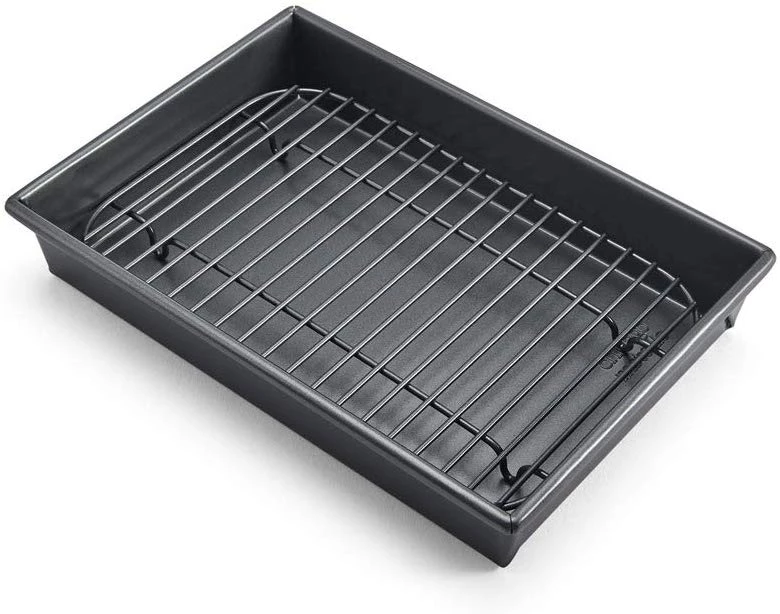 The Chicago Metallic Petite Broil & Roast is the perfect size for one or two servings – no need to pull out a full size pan! Constructed of carbon steel for durability, strength and superior heat conduction and features a non-stick surface, ensuring food does not stick while cooking. This pan can be used for cooking, roasting and baking, don’t be limited to a single use kitchen pan! Use the pan without rack for casseroles or brownies. With a small size, this pan will fit most countertop/toaster ovens! Overall Measurement: 10-Inch by 7-Inch by 1.75-Inch, baking Surface: 9.25-Inch by x 6-Inch. Dishwasher safe but hand washing recommended to preserve the life of this pan.