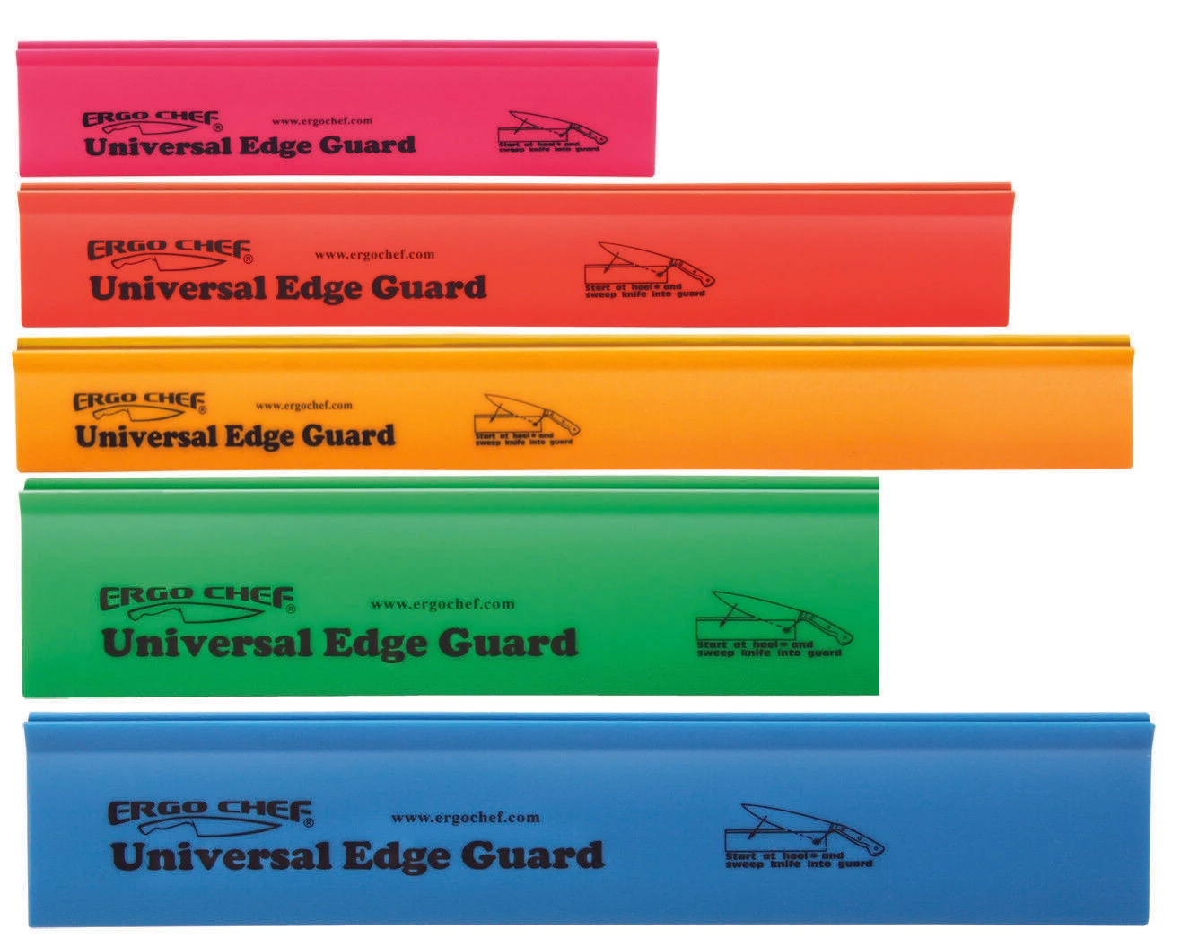 The universal edge guard set by ergo chef includes 2 wide-blade and 3 narrow-blade guards to make a set of 5. The guards protect the edges of your knives – and your fingers, too! store and transport knives safely without damaging or dulling their blade edge. The bright colors help identify knives easily in a drawer or in a knife roll. The guards work on all stamped, forged, and ceramic knives. To clean, wipe with a clean, damp cloth.