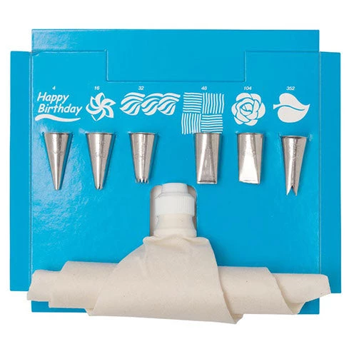 Set contains: a standard coupler attached to a 10″ flex bag, 6 popular decorating tubes, trilingual instructions and recipes