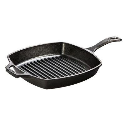 The Lodge Cast Iron Grill Pan allows grease to drain away from the food while creating tantalizing grill marks. This square grill pan is seasoned and ready to use and perfect for cooking bacon, steaks and more.
