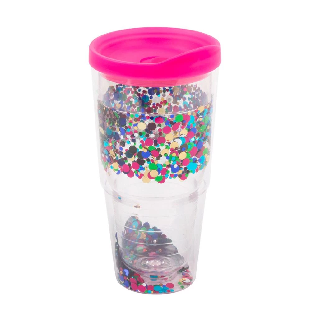 Cue the confetti!!! Our colorful confetti collection is a burst of happiness! Take the party wherever you go when you use our confetti tumbler. This double-walled acrylic cup is full of multi-colored confetti and topped with a bright colored lid!