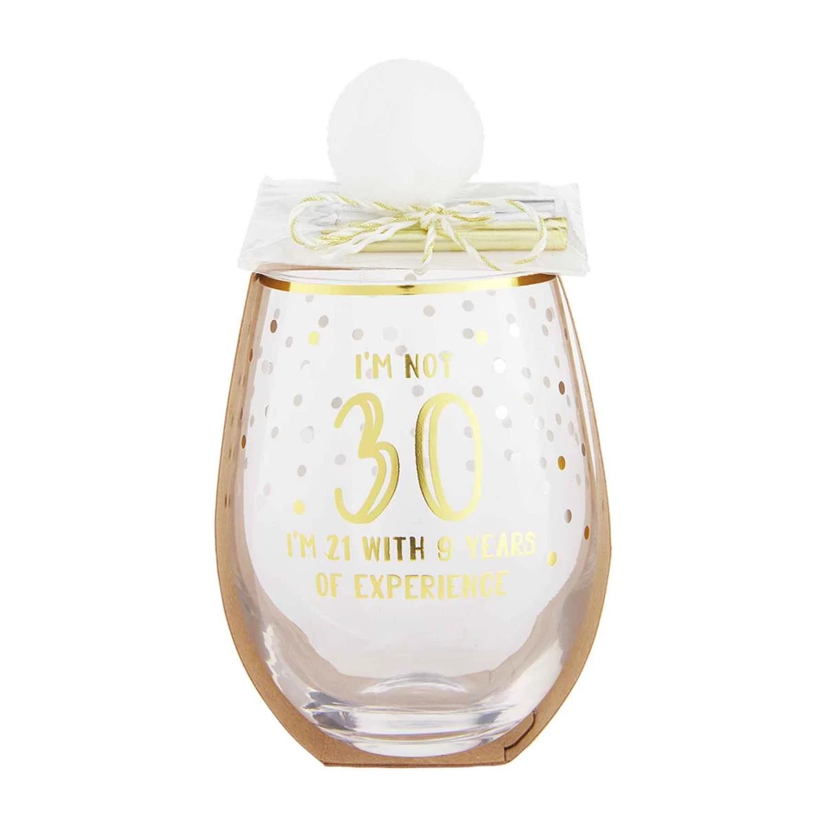 Let’s celebrate the birthday star with our 30th Birthday Wine Glass and Candle Set. The two piece set comes with a foiled stemless wine glass with confetti details. The wine glass features the sentiment “I’m not 30. I’m 21 with 9 years of experience”. The wine glass comes with a pack of six colorful birthday candles.