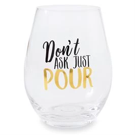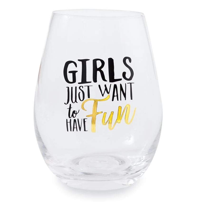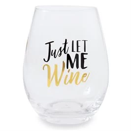 Stemless wine glass features printed “Just LET ME Wine,” “GIRLS JUST WANT to HAVE Fun” or “Don’t ASK JUST POUR” sentiment with gold foil detail.
