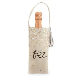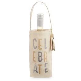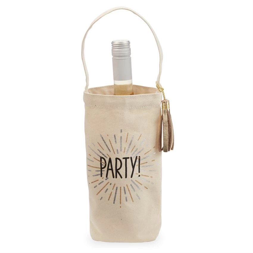 Canvas wine bottle bag features printed and foiled sentiment exterior and leather tassel at handle.