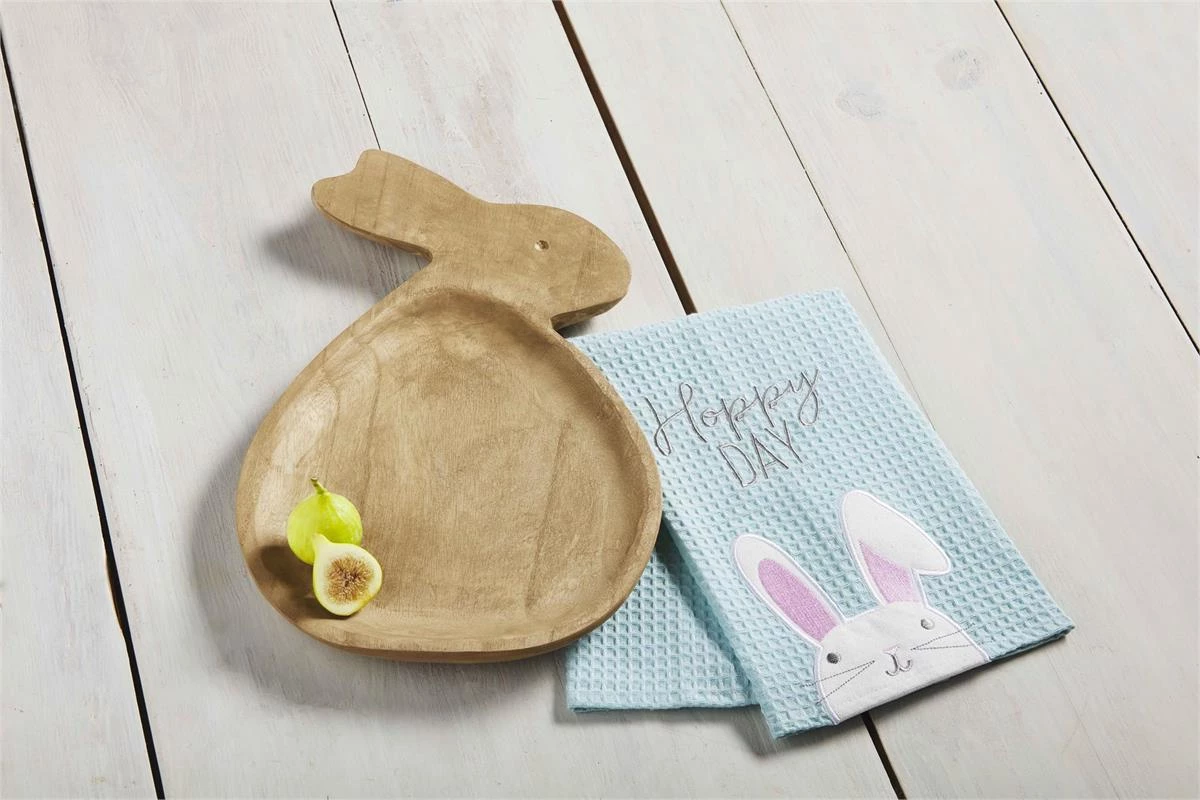 2-piece set. Paulownia wood bunny tray. Comes with embroidered waffle weave towel.
