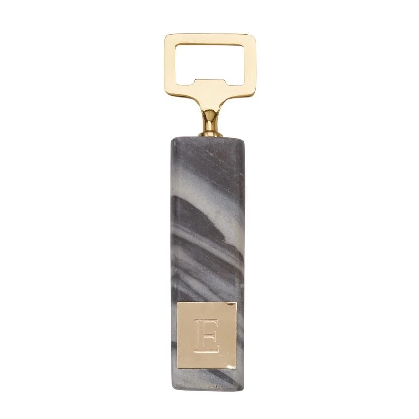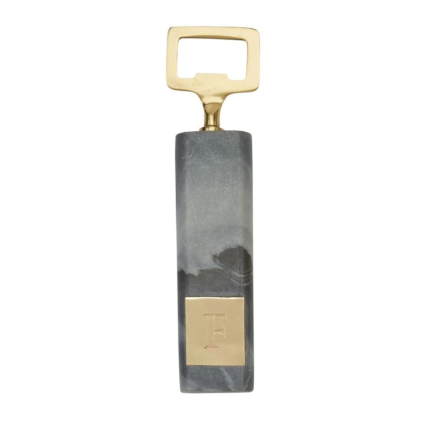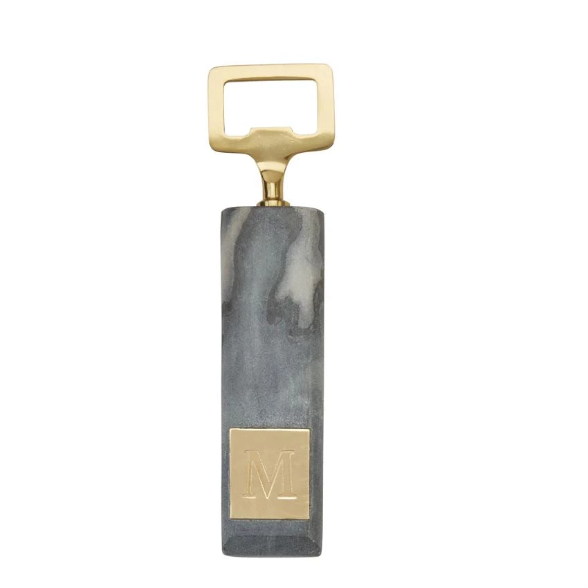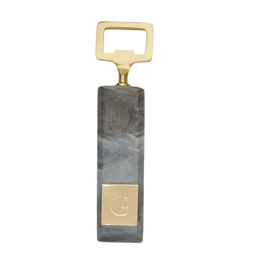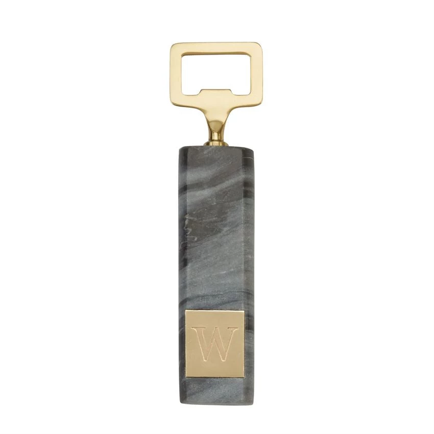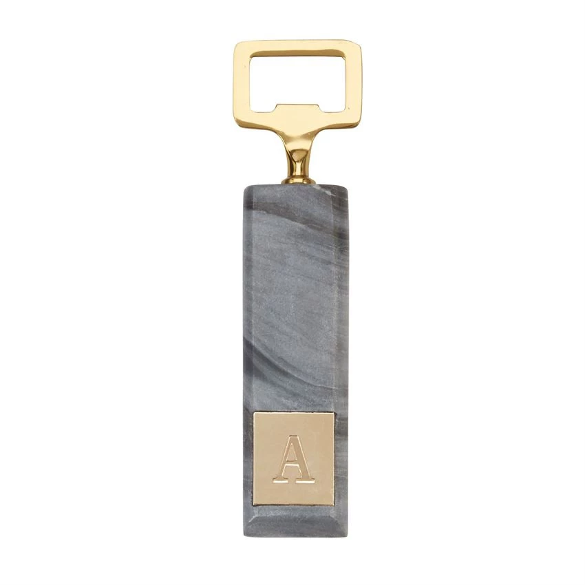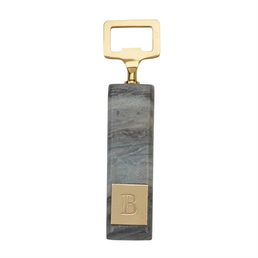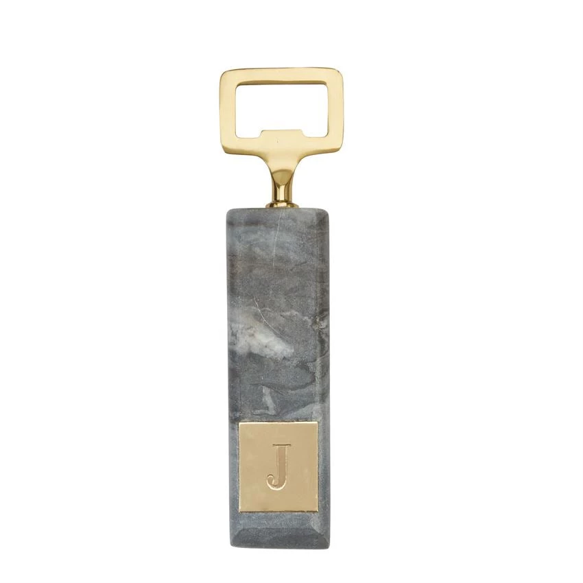 Brass finished metal bottle opener features grey marble handle and coordinating brass finished accent plate with engraved initial.