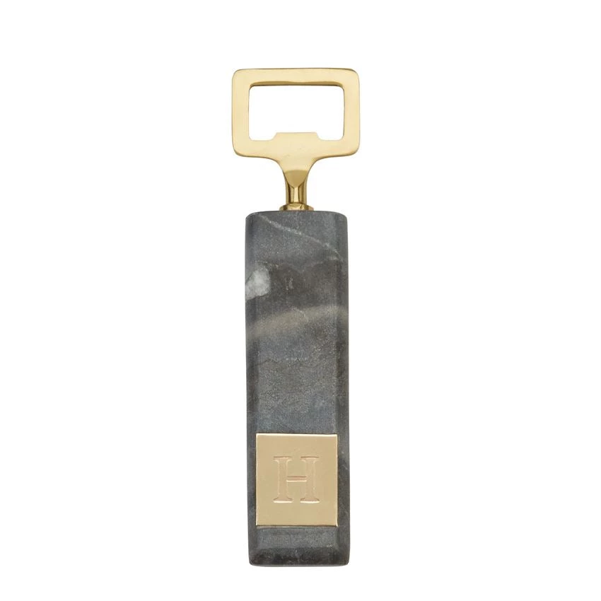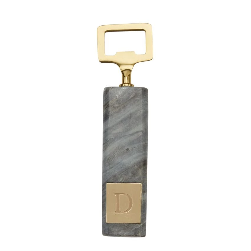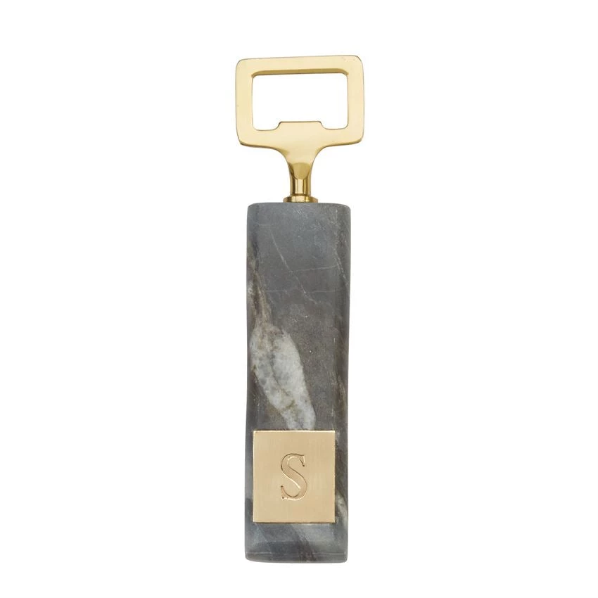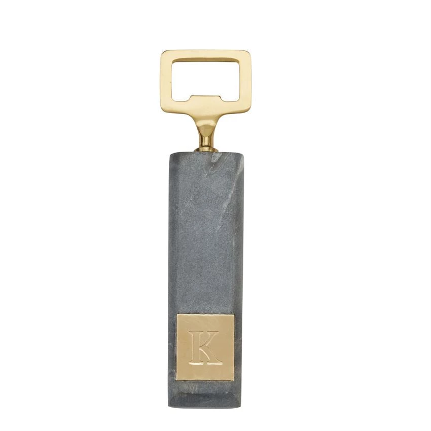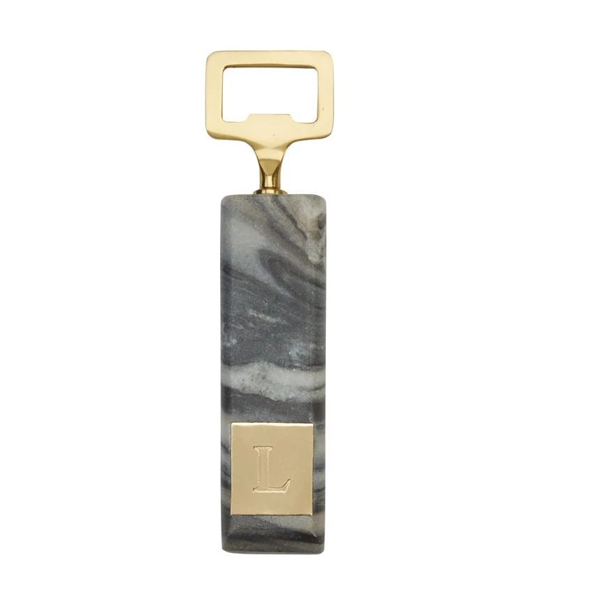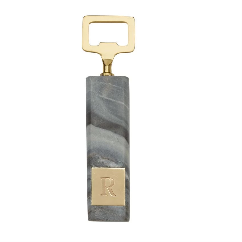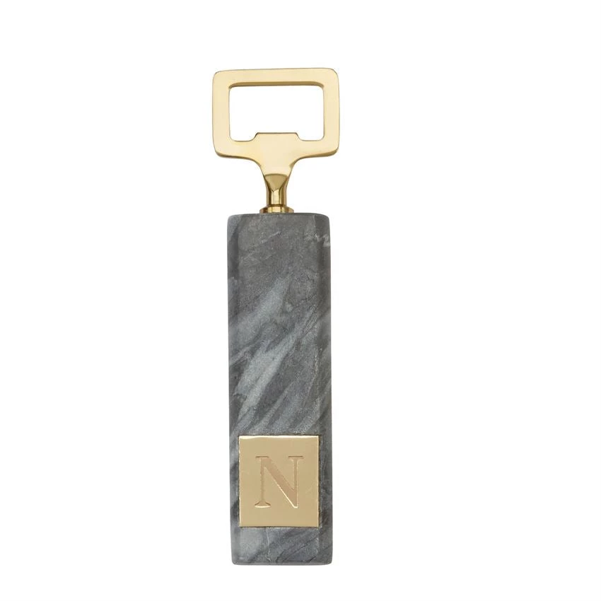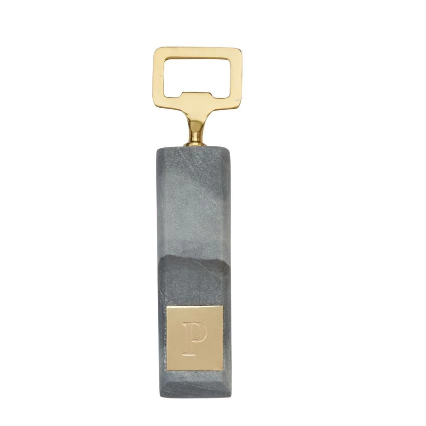 Brass finished metal bottle opener features grey marble handle and coordinating brass finished accent plate with engraved initial.