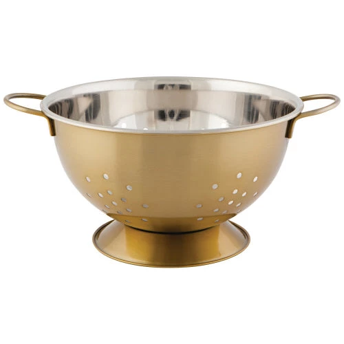 This colorful colander performs equally well holding fruit or straining pasta. Powder coated steel contrasts brightly against the stainless steel rim and handles while a flat base ensures stability.