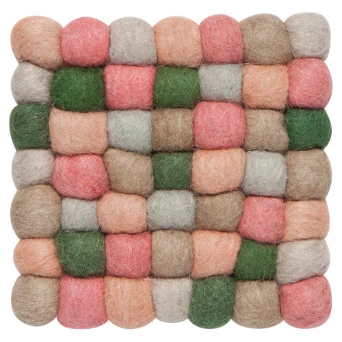 Ombre colors create a kaleidoscope pattern on these cozy woolen trivets. Each sphere is hand-felted and connected creating an unusual, textural statement for the kitchen or table.