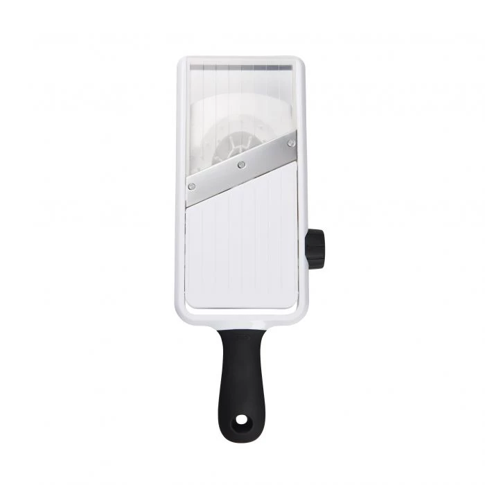 The Large Hand-Held Mandoline Slicer features 7 thickness options, food holder and stainless steel blade for perfect, even slices. The clear surface shows slices accumulating below and the wide ramp accommodates a variety of vegetables. Non-slip notches allow for slicing directly over bowls.