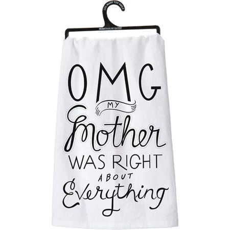 A black and white cotton dish towel lending an “OMG My Mother Was Right About Everything” sentiment that complements well with existing decor. Machine-washable.
