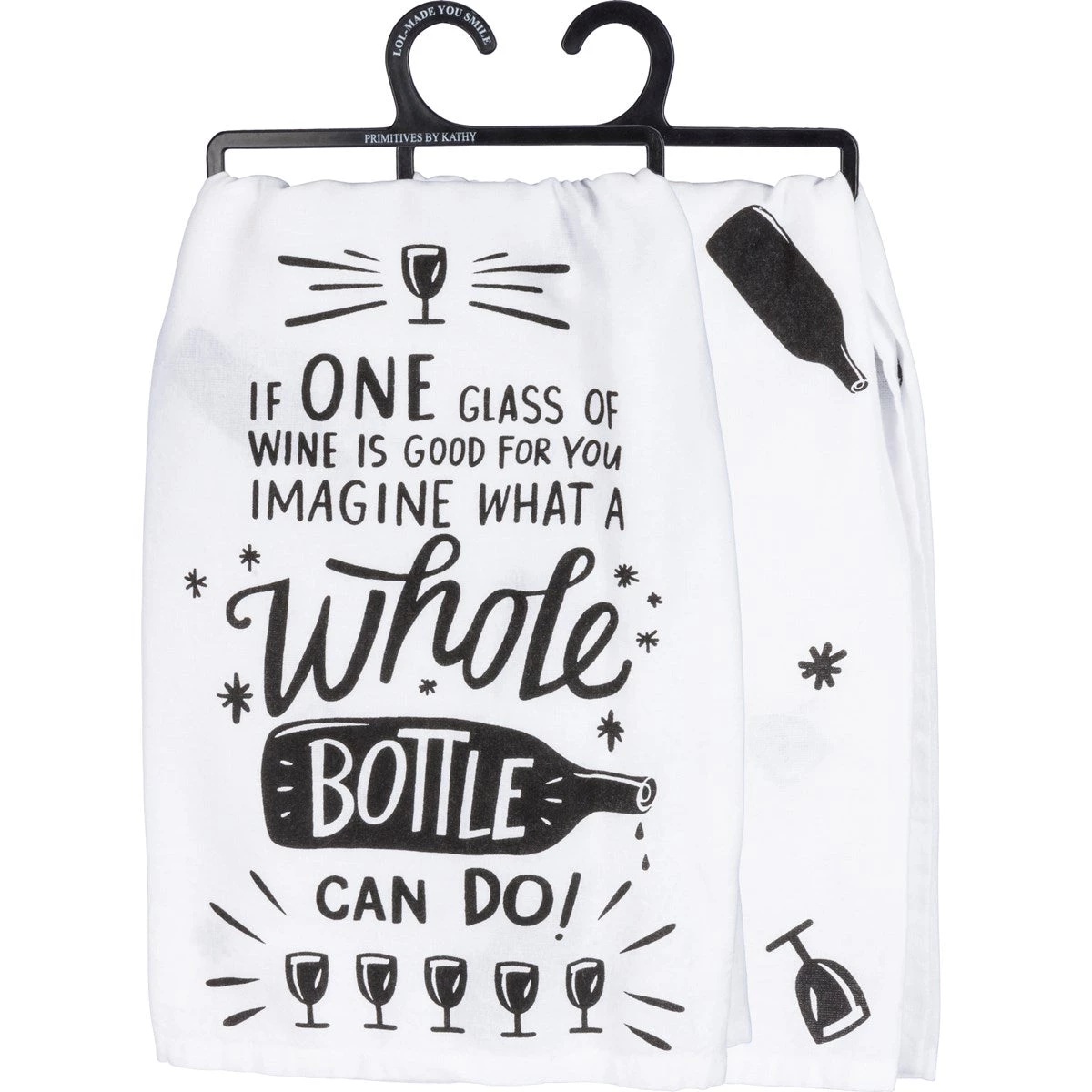 Cotton double-sided print dish towel featuring “If One Glass Of Wine Is Good For You Imagine What A Whole Bottle Can Do” sentiment with wine glass designs. Machine-washable.