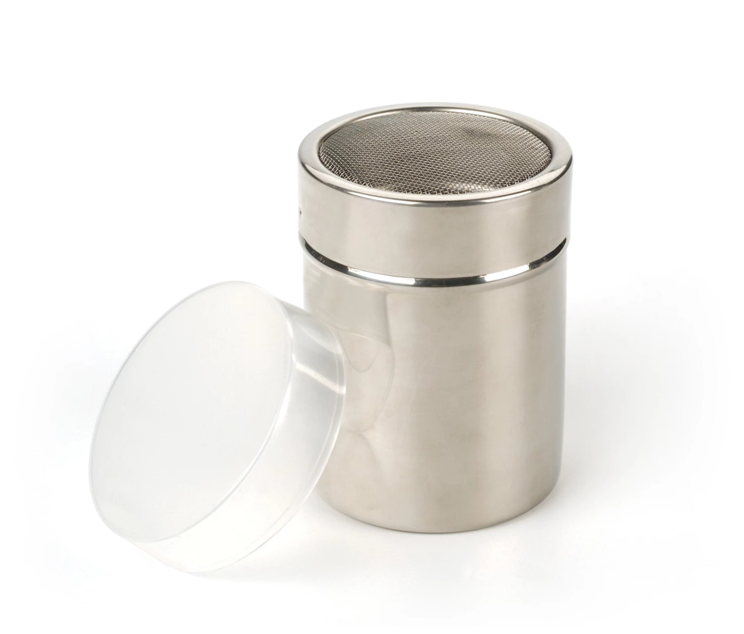 Great for adding powdered sugar, spices or cocoa to lattes, cappuccinos, hot chocolate or pastries. Made from dishwasher safe polished 18/8 stainless steel with an airtight plastic cover. 11 oz. capacity.