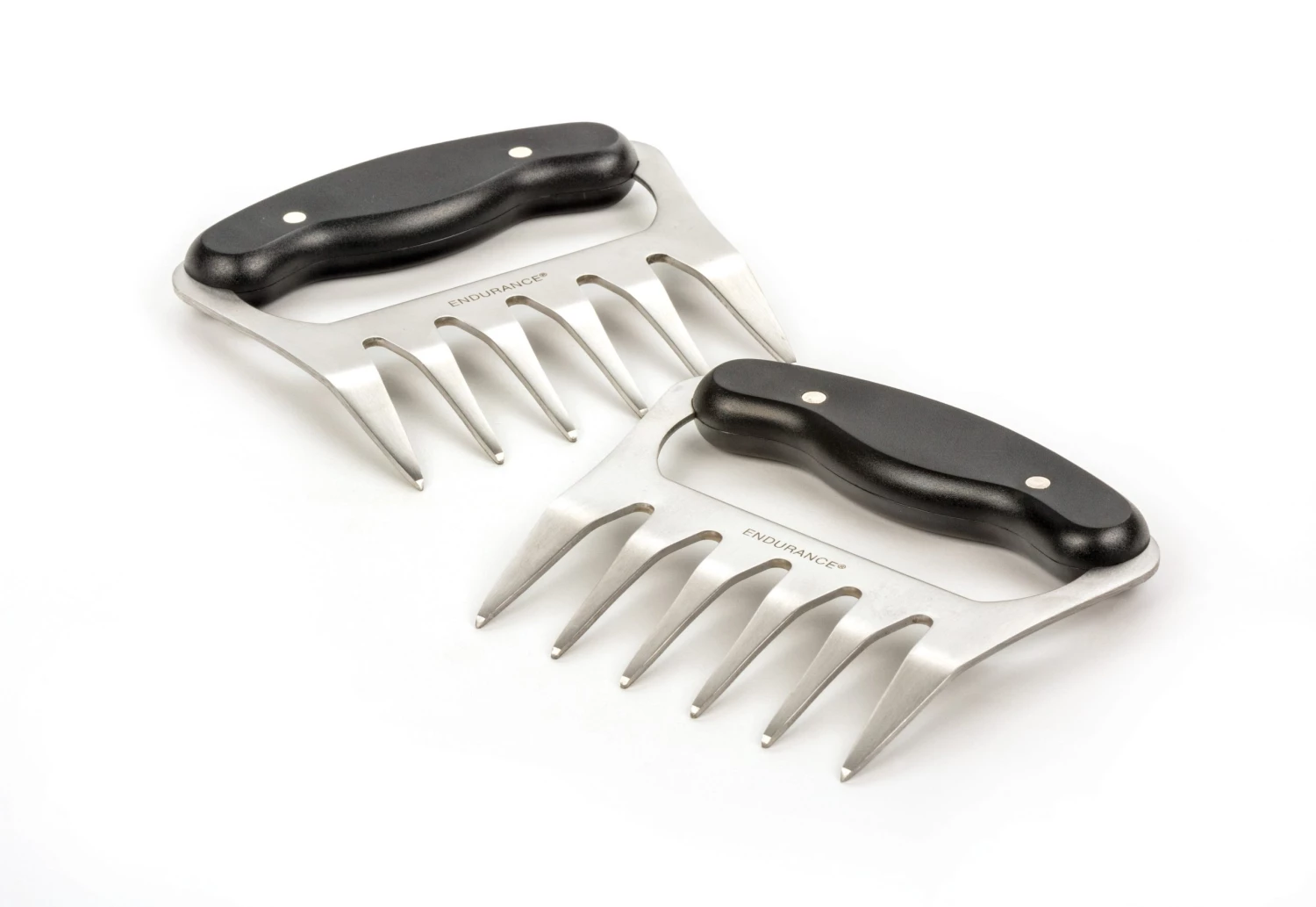Shredding pork, brisket or chicken is easy with this pair of stainless steel meat claws. The contoured handles accommodate both large and small hands providing comfortable control while handling large cuts of meat. This multi-use tool is perfect for lifting and shredding meat but can also be used for holding food in place while carving or even tossing a salad. Made from dishwasher safe stainless steel. Overall: 5-1/4″ x 5″ (2″ long prongs).