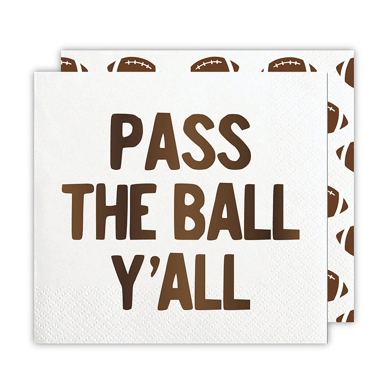 - White napkin with the phrase “Pass the ball y’all” in foil lettering