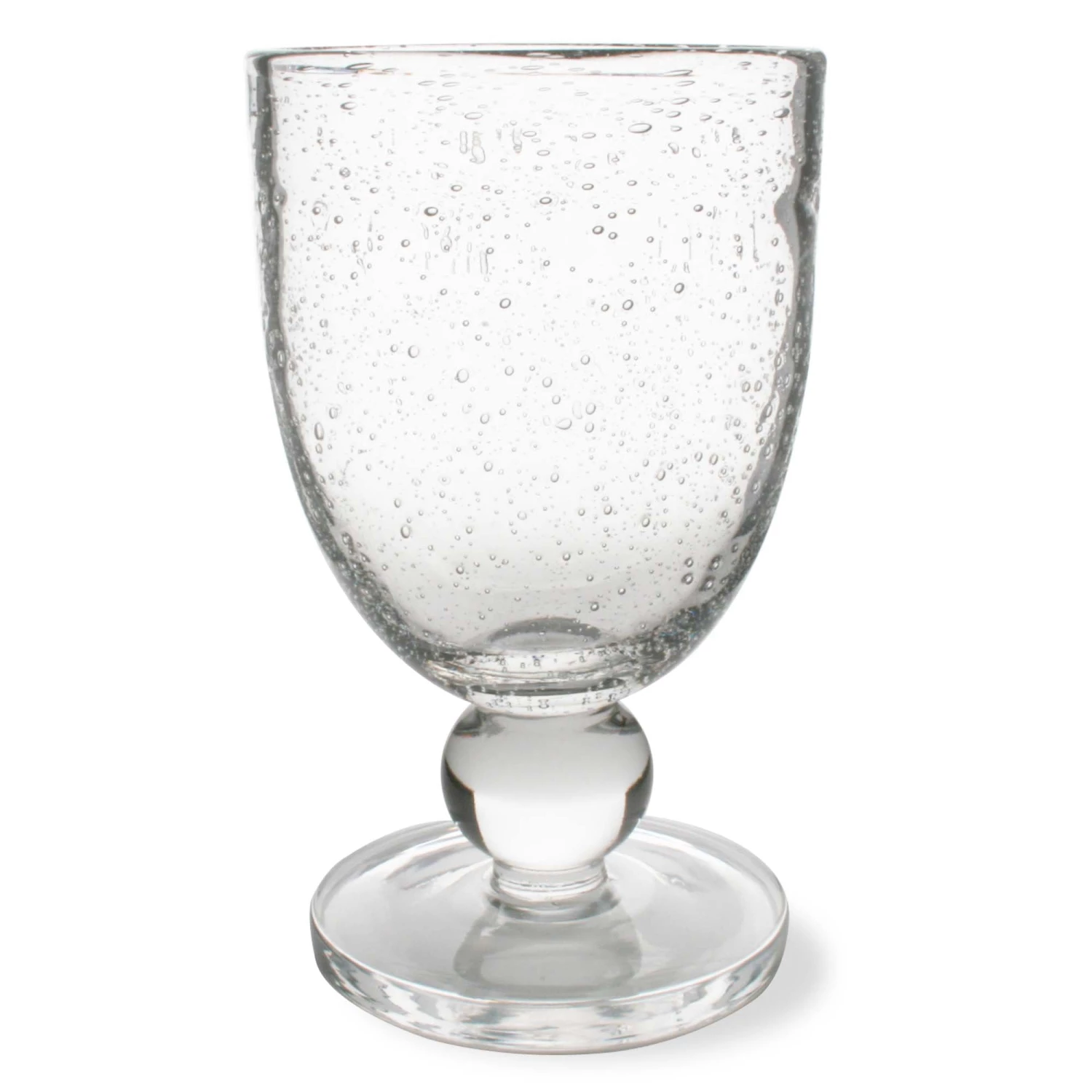 Clear bubble glass goblets have a truly festive charm. Each is handcrafted and designed with hundreds of miniature bubbles floating inside the glass, forming unique patterns and optical effects. Clear glass stem features globe-like accent.