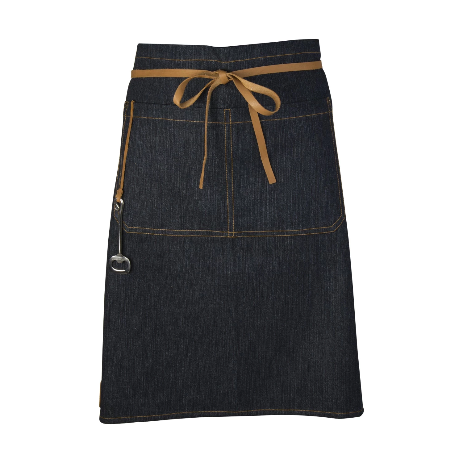 Cook and serve in this stylish cafe apron! Made of denim with leather waist ties and includes a stainless steel bottle opener with an embossed stamp on the leather patch. Includes two pockets.