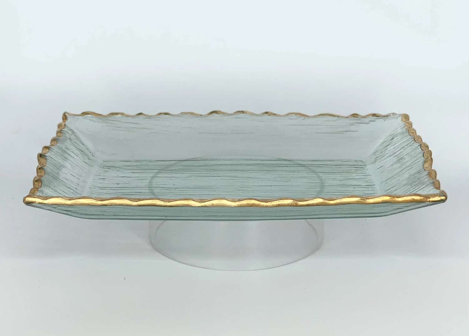 Rectangular shaped glass serving tray with subtle bubble accents and metallic gold border. We like using this as a serving piece for entertaining, or keeping jewelry organized!