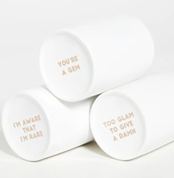- Three assorted colors and sayings: Canary Yellow/I’m Aware, Emerald/Too Glam, Pink Diamond/Gem