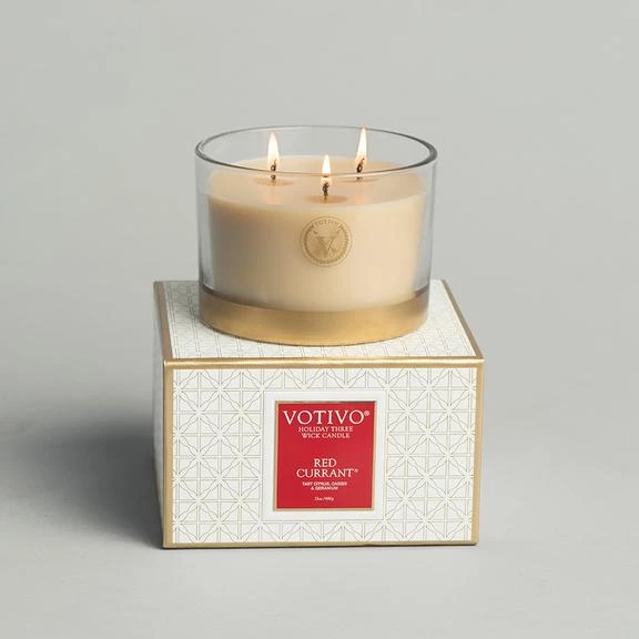 A coveted delicacy for the senses, Red Currant opens with galbanum, cassis, and citrus followed by floral stories of geranium and rose. Full-bodied black currant tamed by sugar and fruit musk finishes the fragrance. Adding a mega dose of decadence to the Holiday Collection, this oversized option is heavy on luxe and seasonal style. Modeled after the Holiday Candle just in amplified form, the Three Wick Candle features a glass design with golden logo and painted base, served up in a white and gold geometric printed box. Now you can light and enjoy your favorite holiday fragrance for 50 to 55 hours. Content/weight 480g (17 oz).
