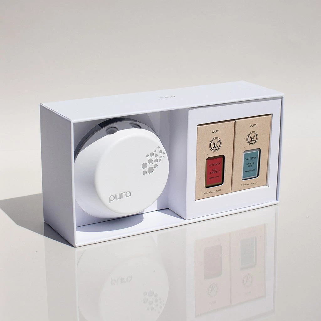 This Smart Home Fragrance Diffuser powered by Pura allows you to delight in the simplicity of your Votivo moment as it fills your home with two of our best-selling fragrances. Once you plug in and set up your diffuser using the Pura app, you can then control your device from virtually anywhere and set custom schedules for your one-of-a-kind life.